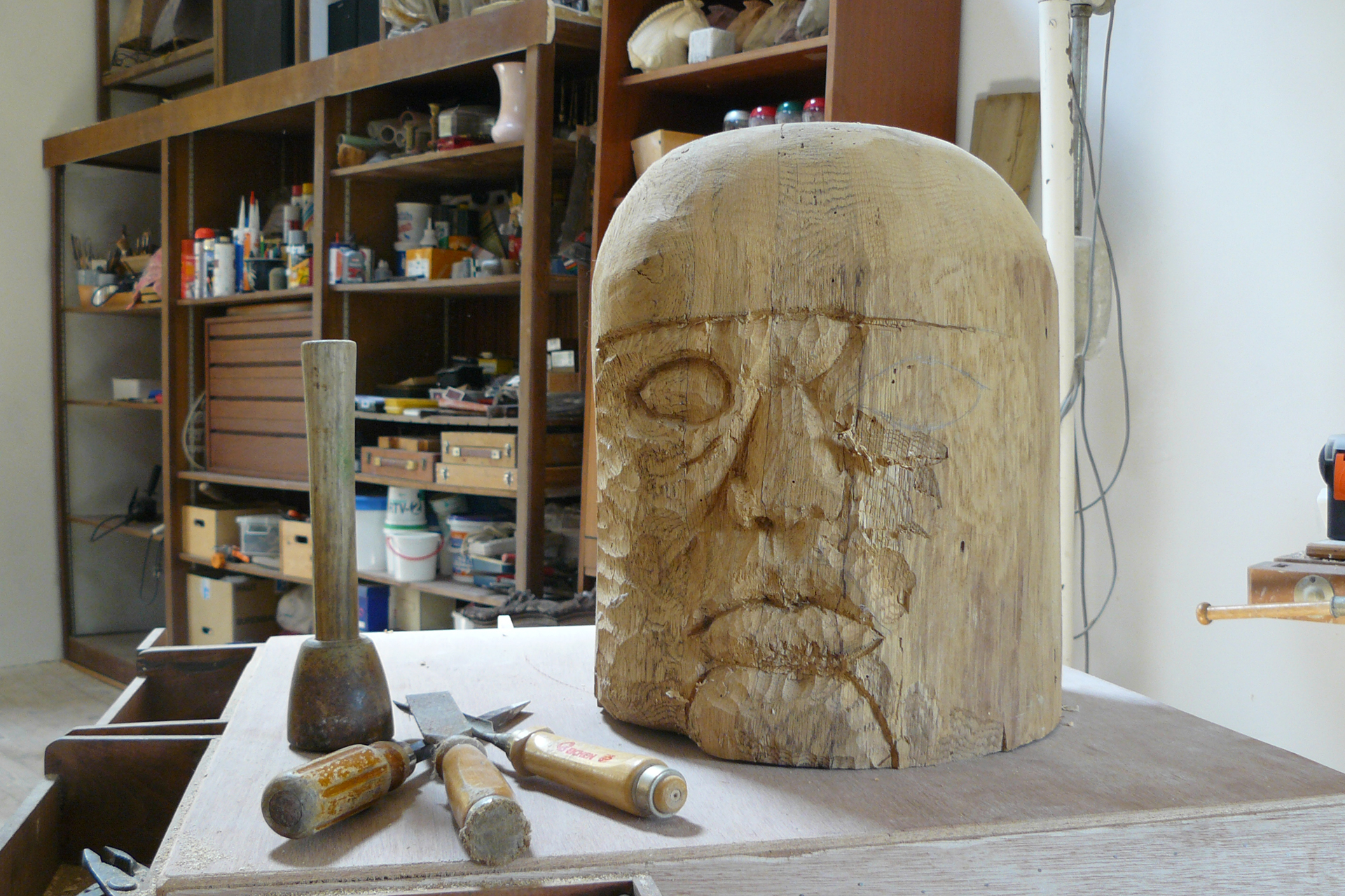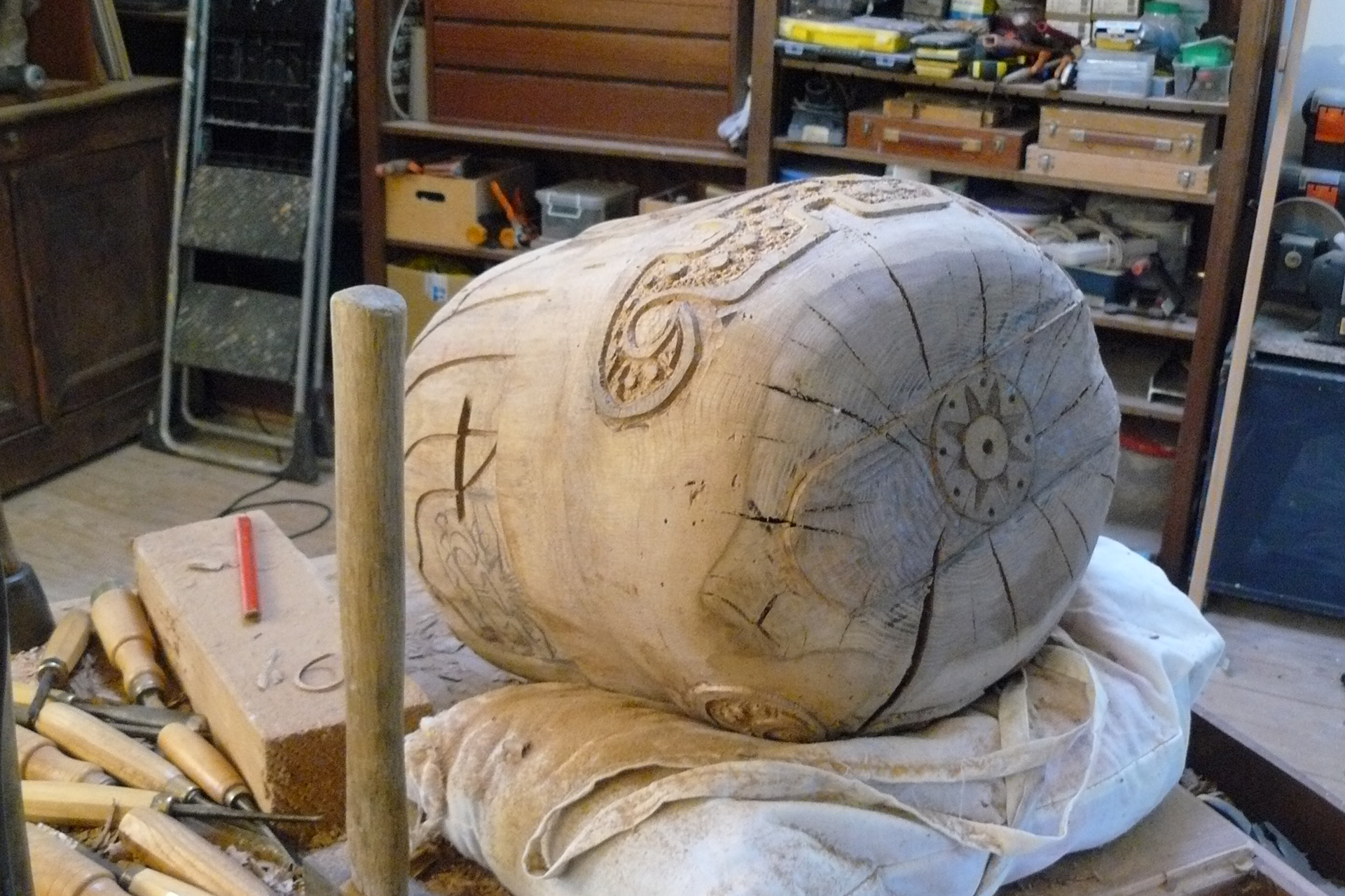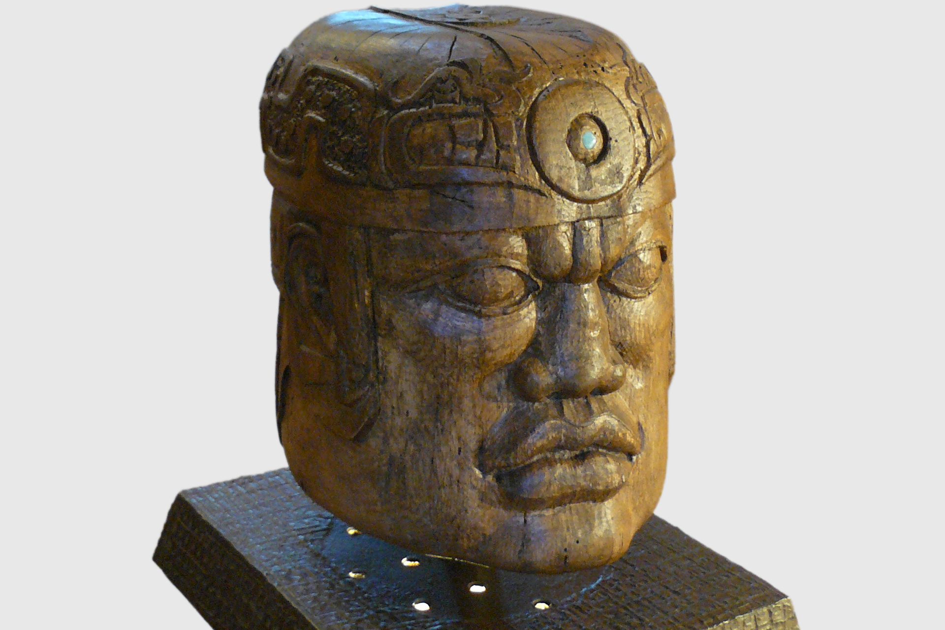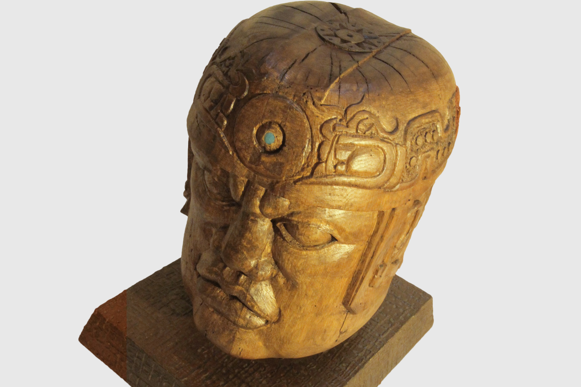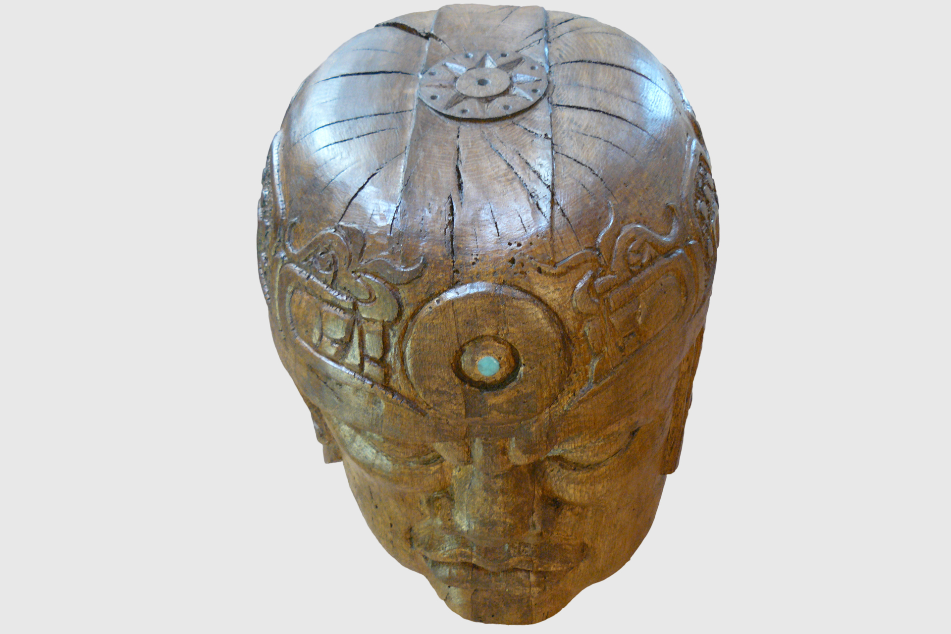 Matière : Bois sculpté avec incrustation de pierre semi-précieuse sur un pied en métal enduit